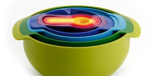 The 9-piece set is BPA free and have non-slip bases with wide carry handles. You can read more about it here: Joseph Joseph 9 Piece Compact Mixing Bowl, Food Prep and Measuring Set.